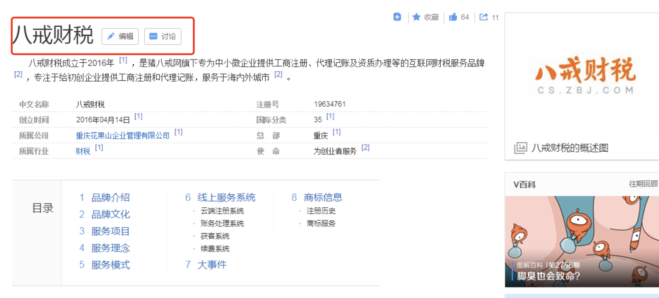 第一,八戒财税百科,涵盖了品牌介绍、品牌文化、服务项目、服务理念、服务模式、线上线下系统、大事件、商标信息等8个板块,内容丰富充实。